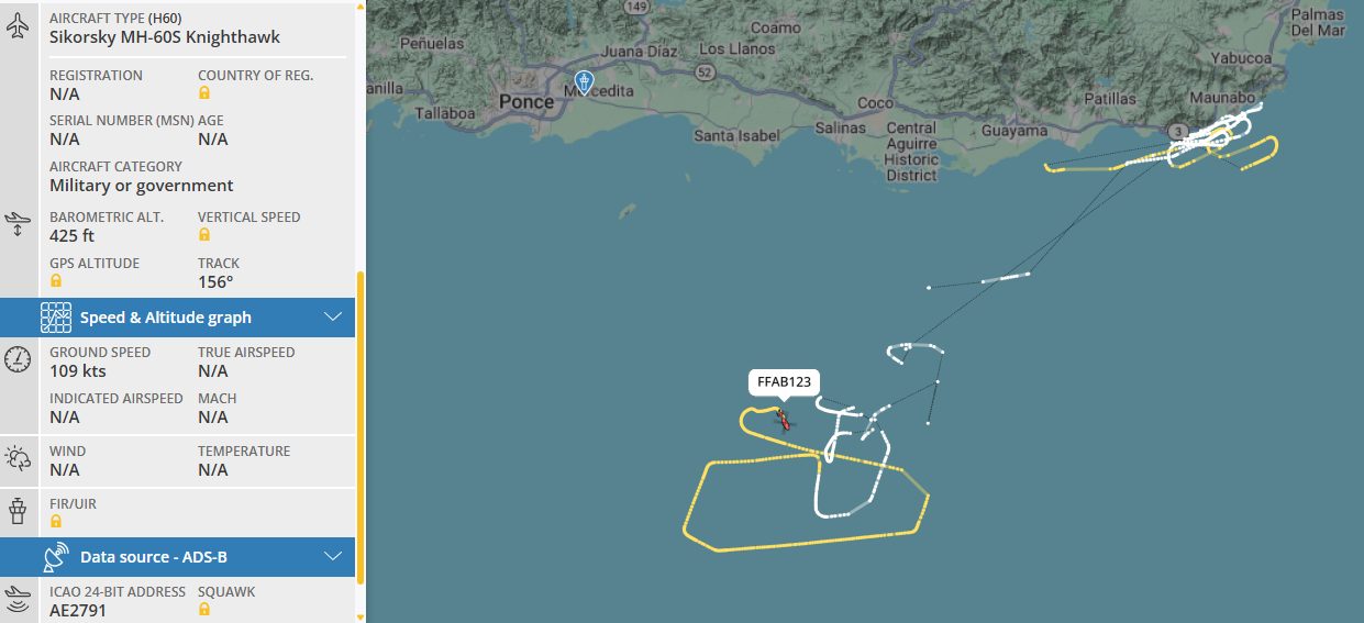 Particularmente, un helicóptero que encendió su sistema de identificación automática (AIS, por sus siglas en inglés) fue protagonista de la jornada. Según datos del monitor de tráfico aéreo FlightRadar24, la aeronave modelo MH-60S Knighthawk se desplazó mar adentro y realizó una serie de maniobras durante más de cuatro horas.