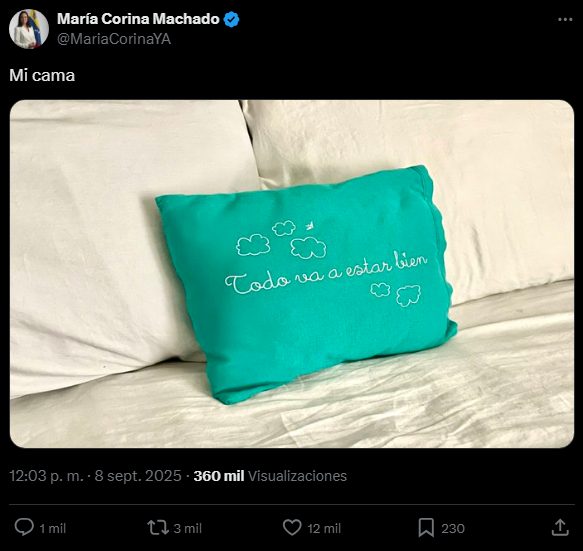 La líder democrática venezolana, María Corina Machado, posteó este lunes una fotografía de su cama y estallaron las especulaciones en redes sociales, donde muchos argumentaron que se escondía algún tipo de mensaje críptico en la publicación.