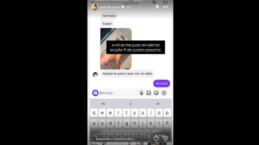 El 9 de julio, Isabella Ladera recibió un mensaje que cambiaría el rumbo de su vida. En una captura de pantalla publicada en sus redes sociales, se observa la conversación con una persona cercana, a quien identifica como “hermano”. En ese intercambio, la voz de advertencia fue directa: “Alguien te quiere rayar con un video”.