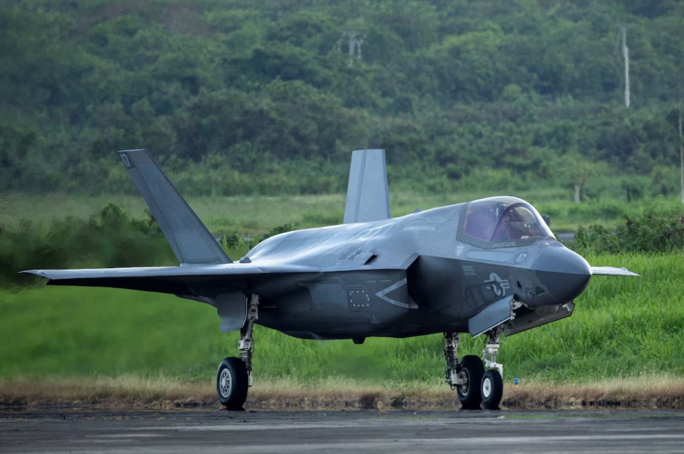 Un avión de combate F-35 se encuentra en la pista de la antigua base militar Roosevelt Roads en Ceiba, Puerto Rico, el 13 de septiembre de 2025. REUTERS/Ricardo Arduengo