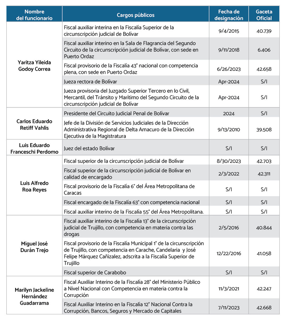 En Bolívar. En el estado Bolívar, al sur del país, se ha conocido de la aprehensión del abogado Carlos Eduardo Retiff Vahlis, presidente del Circuito Judicial Penal de esa entidad desde mayo de 2024, así como de la jueza rectora Yaritza Yileida Godoy Correa y del fiscal superior Luis Alfredo Roa Reyes.