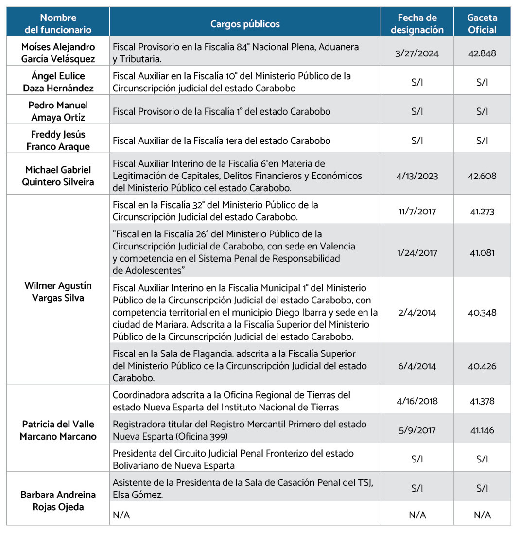 Los aprehendidos en Carabobo son: Marilyn Jackeline Hernández Guadarrama, Gabriel José Sánchez Pirela, Michael Gabriel Quintero, Omar Antonio Ramos, Gabriel José Almea Hernández, Lerwis Alejandro Osorio Pimentel, Ángel Eulice Daza Hernández, Wilmer Agustín Vargas Silva y Ángelo José Dorta Sivira, quien estuvo en el Cuerpo de Investigaciones Científicas, Penales y Criminalísticas (CICPC) hasta 2018. Aunque el martes 9 de septiembre, se informó de la captura de Pedro Manuel Amaya Ortíz y Freddy Jesús Franco Araque, fiscal provisorio y fiscal auxiliar primero del estado Carabobo. Entre los señalados figuraba Luis Enrique Maldonado Vásquez, quien, según versiones de prensa, encontrado sin vida el jueves 4 de septiembre de 2025.
