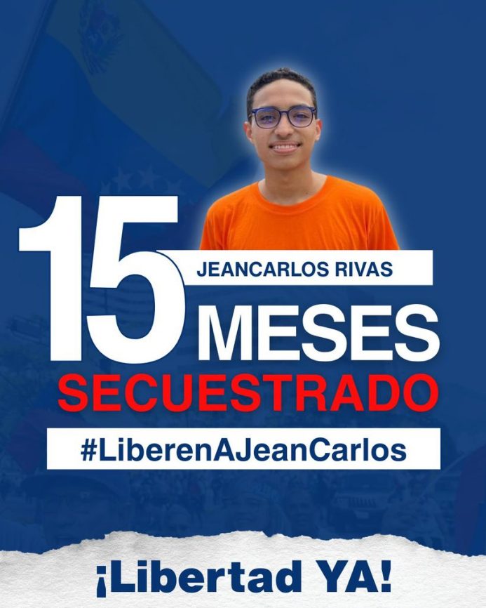El partido opositor venezolano Voluntad Popular (VP) exigió este domingo la liberación de su coordinador juvenil en el estado La Guaira, Jeancarlos Rivas, de 20 años, quien fue detenido hace 15 meses.