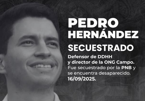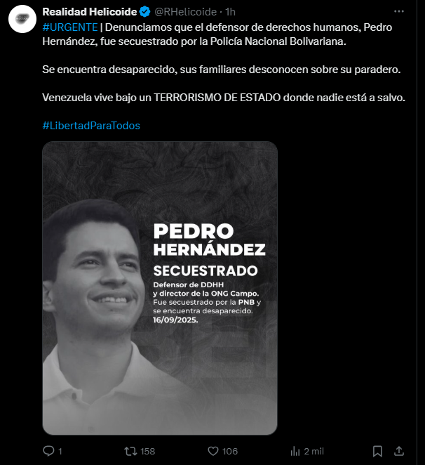 La organización Realidad Helicoide denunció la noche de este martes 16 de septiembre, la desaparición del defensor de derechos humanos Pedro Hernández, quien habría sido secuestrado por funcionarios de la Policía Nacional Bolivariana (PNB) en circunstancias aún no esclarecidas.