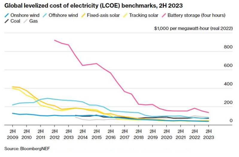 En 2023, las renovables alcanzaron el 30% de la generación eléctrica, con la solar (LCOE: 41 USD/MWh) y la eólica aportando la mitad (Ember, 2024). Las baterías (125 GWh instalados), al superar la idea de que «la electricidad no era almacenable», han impulsado los VE, con costos operativos de 0.6-0.8 USD/100 km frente a 5-14.4 USD/100 km de gasolina/diésel (IEA, 2024)