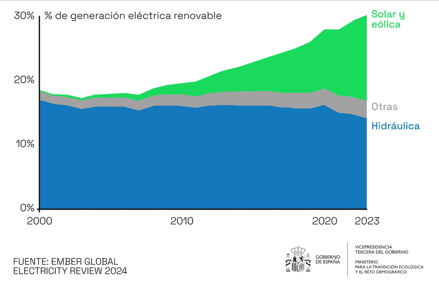 Las energías renovables, lideradas por la solar y la eólica, han transformado la generación eléctrica global, alcanzando el 30% de la producción en 2023, frente al 20% en 2010 (Ember, 2024). La solar y la eólica aportaron cerca de la mitad de este total, impulsadas por avances tecnológicos y redes inteligentes que gestionan su intermitencia.
