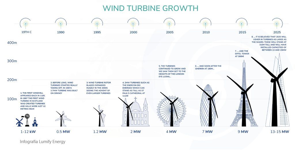 Desde 2010, la eólica ha experimentado una transformación radical. En la eólica terrestre, las turbinas han pasado de 2 MW a 5-8 MW en promedio, con rotores más grandes y torres optimizadas para capturar vientos a mayor altura. En la eólica marina, los avances han sido aún más notables: turbinas de 15-20 MW, como la V236-15.0 MW de Vestas, están en operación, y prototipos de 22 MW se encuentran en desarrollo.