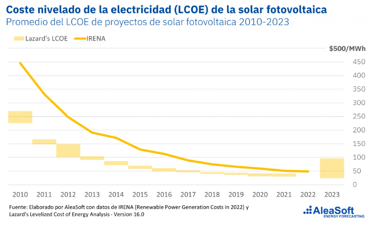 El LCOE promedio ponderado global de las plantas fotovoltaicas a gran escala disminuyó un 89% entre 2010 y 2022, pasando de 445 USD/MWh a 49 USD/MWh (IRENA, 2024).