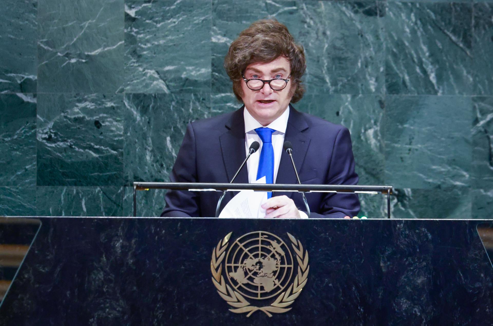 El presidente de Argentina, Javier Gerardo Milei, habla durante el Debate General del 80º período de sesiones de la Asamblea General de las Naciones Unidas (AGNU) en la sede de Naciones Unidas en Nueva York (EE.UU.), 24 de septiembre de 2025. (Nueva York) EFE/EPA/KENA BETANCUR