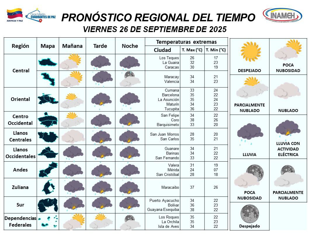 El Instituto Nacional de Meteorología e Hidrología (Inameh) prevé que para este viernes se espera cielo con nubosidad parcial, alternando con nubosidad fragmentada, con posibilidad de precipitaciones en varios estados del país.
