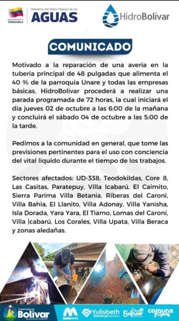 El organismo hidrológico de Bolívar informó a través de un comunicado en redes sociales que el Eje Atlántico de Ciudad Guayana estará sin servicio de agua desde el jueves 2 de octubre hasta el próximo sábado 4 de octubre debido a trabajos de mantenimiento.