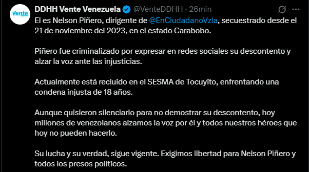 “Aunque quisieron silenciarlo para no demostrar su descontento, hoy millones de venezolanos alzamos la voz por él y por todos nuestros héroes que hoy no pueden hacerlo. Su lucha y su verdad siguen vigentes. Exigimos libertad para Nelson Piñero y todos los presos políticos”, expresó el Comité de DDHH de Vente Venezuela en su publicación.