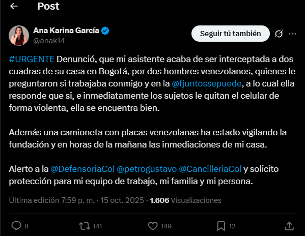 La activista venezolana y presidenta de la Fundación Juntos Se Puede, Ana Karina García, denunció a través de su cuenta oficial de X un grave incidente de seguridad que involucra a su equipo de trabajo y a su entorno familiar.