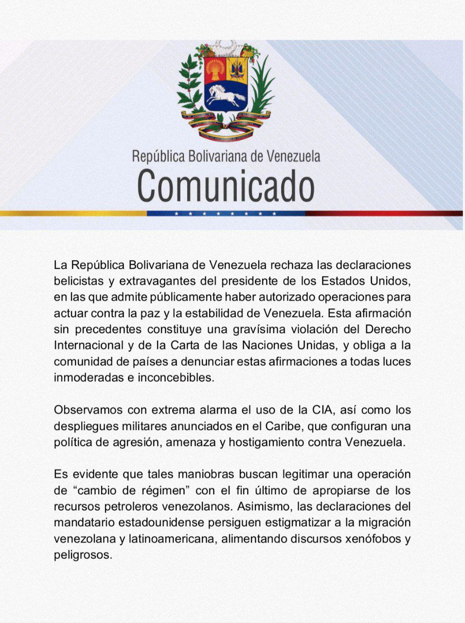 En un comunicado publicado en la cuenta de Telegram de Yván Gil, la Cancillería venezolana calificó las declaraciones de Trump como «belicistas y extravagantes» y una «gravísima violación del Derecho Internacional y de la Carta de las Naciones Unidas».