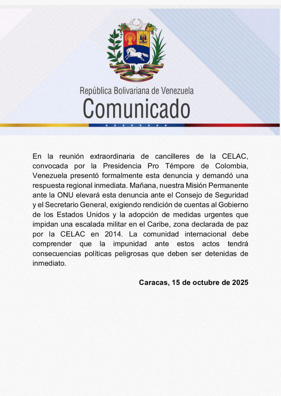 Mañana, la Misión Permanente de Venezuela ante la ONU presentará formalmente el caso ante el Consejo de Seguridad y el Secretario General, «exigiendo rendición de cuentas al Gobierno de los Estados Unidos y la adopción de medidas urgentes que impidan una escalada militar en el Caribe».