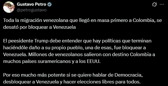 Petro argumentó que la política de sanciones de Estados Unidos es la causa directa de la crisis migratoria que afecta a todo el hemisferio, dejando de lado que el éxodo masivo de venezolanos comenzó 5 años antes de las medidas económicas del gobierno norteamericano contra el régimen de Maduro. Así, el mandatario colombiano afirmó que la estrategia de Washington es contraproducente incluso para sus propios intereses.