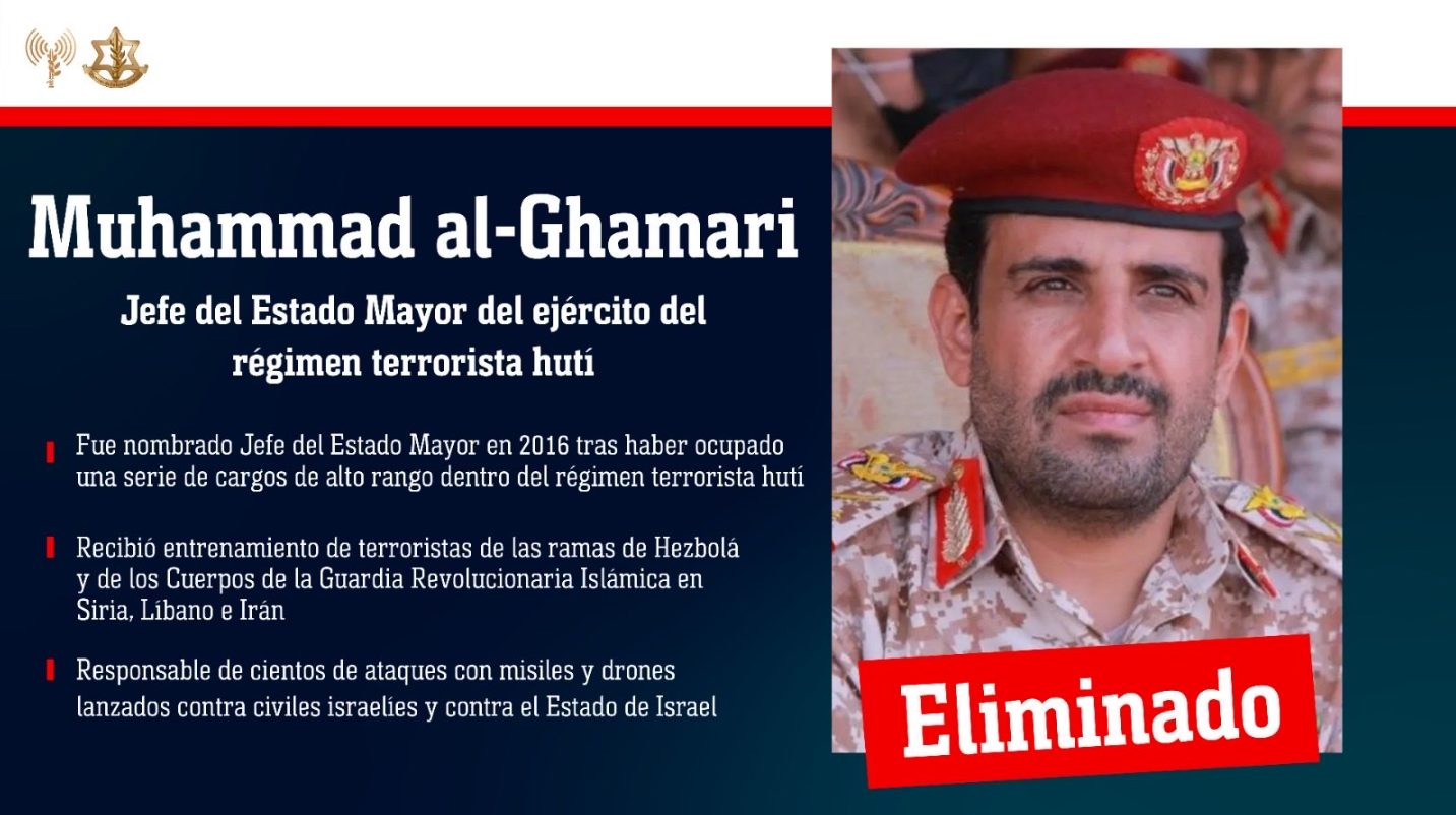 El jefe del Estado Mayor de los hutíes, que fue objetivo de varios ataques de Israel, murió «junto con algunos de sus compañeros y su hijo, Hussein, de 13 años», indicó el comunicado, y señaló que Al Ghamari «ascendió como un mártir en curso de su labor yihadista y el cumplimiento de su deber religioso, en la caravana de grandes mártires camino a Jerusalén».