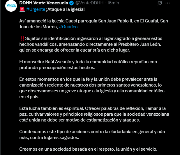 El Comité de Derechos Humanos del partido Vente Venezuela, denunció la tarde de este jueves 23 de octubre, un ataque vandálico contra la Iglesia Cuasi Parroquia San Juan Pablo II, ubicada en la urbanización El Guafal, en San Juan de los Morros, estado Guárico.