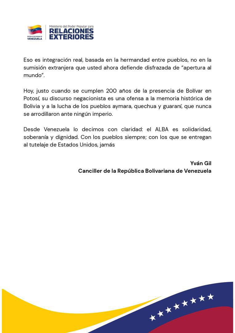 Yván Gil, firmante del documento afirma que «hablar con tanta ligereza de lo que no conoce solo confirma su desconexión con el pueblo y su alineamiento con los intereses de las élites que siempre traicionaron a Bolivia».