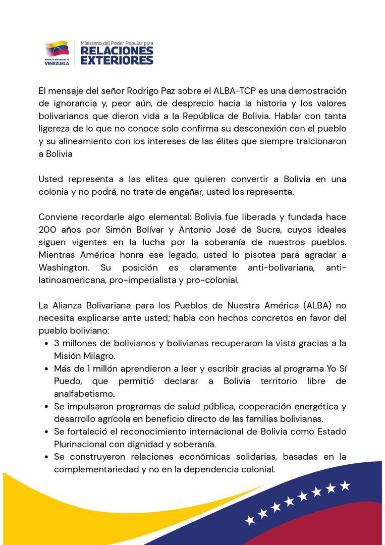 «El mensaje del señor Rodrigo Paz sobre el ALBA-TCP es una demostración de ignorancia y, peor aún, de desprecio hacia la historia y los valores bolivarianos que dieron vida a la República de Bolivia», señala el comunicado.