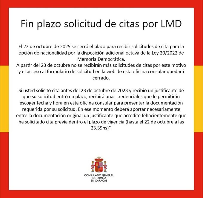El Consulado de España en Caracas anunció este lunes 27 de octubre la conclusión del período para solicitar nuevas citas para optar a la nacionalidad española a través de la Ley 20/2022, conocida como Ley de Memoria Democrática o «ley de nietos».