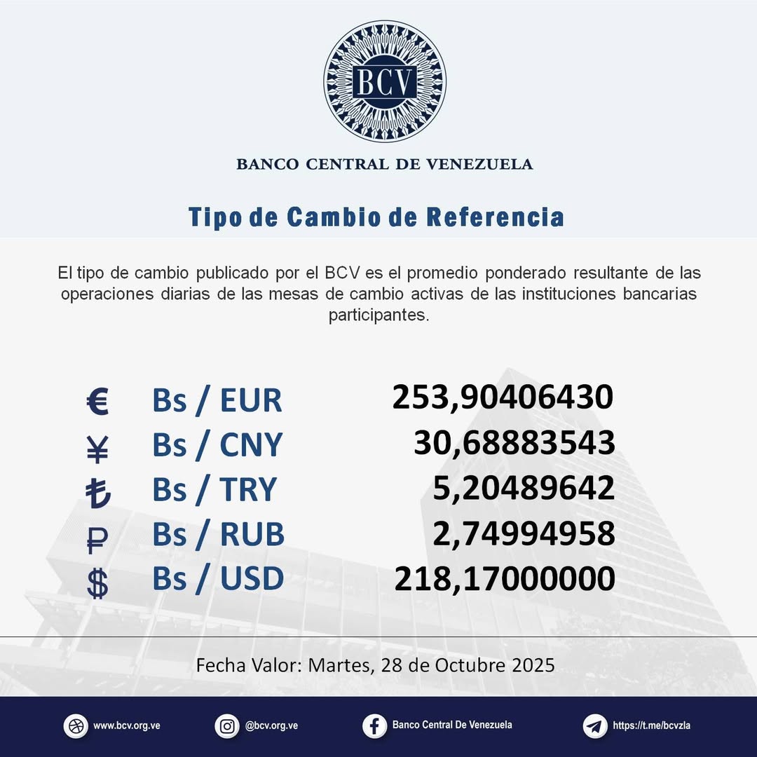 El Banco Central de Venezuela (BCV) informó este lunes sobre un nuevo ajuste en el tipo de cambio oficial, que entrará en vigencia el martes 28 de octubre.
