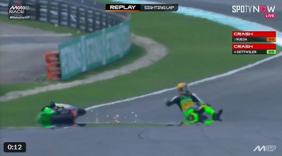 En ese momento previo de la carrera, la moto del español José Antonio Rueda (KTM) impactó por detrás de la máquina del helvético que ha sido el que ha salido peor parado de los dos.