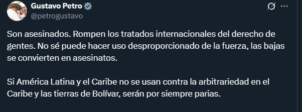 “Son asesinados. Rompen los tratados internacionales del derecho de gentes. No sé puede hacer uso desproporcionado de la fuerza, las bajas se convierten en asesinatos”, dijo el mandatario colombiano a través de su cuenta en X.