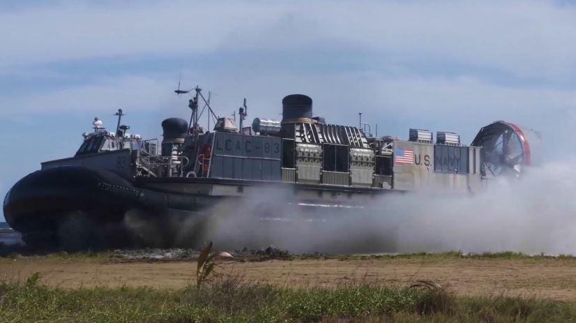 El metraje muestra un LCAC -un gran aerodeslizador que transporta tropas, vehículos y equipamientos- al realizar un desembarco anfibio con apoyo de varias unidades de helicópteros de transporte UH-1Y, desde los que los marines también ensayaron desembarcos, y helicópteros de ataque Apache.