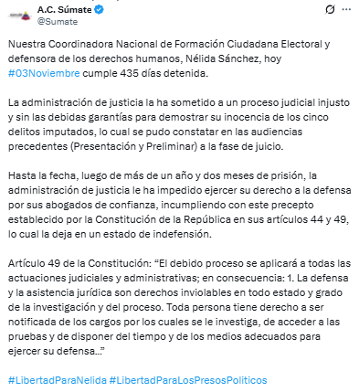 La Asociación Civil Súmate alertó este 3 de noviembre sobre la situación de la defensora de derechos humanos, Nélida Sánchez, quien cumple 435 días privada de libertad.