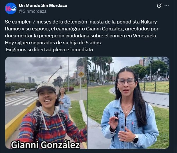 “Se cumplen siete meses de la detención injusta de la periodista Nakary Ramos y su esposo, el camarógrafo Gianni González, arrestados por documentar la percepción ciudadana sobre el crimen en Venezuela. Hoy siguen separados de su hija de cinco años”, dijo la ONG a través de su cuenta en X.