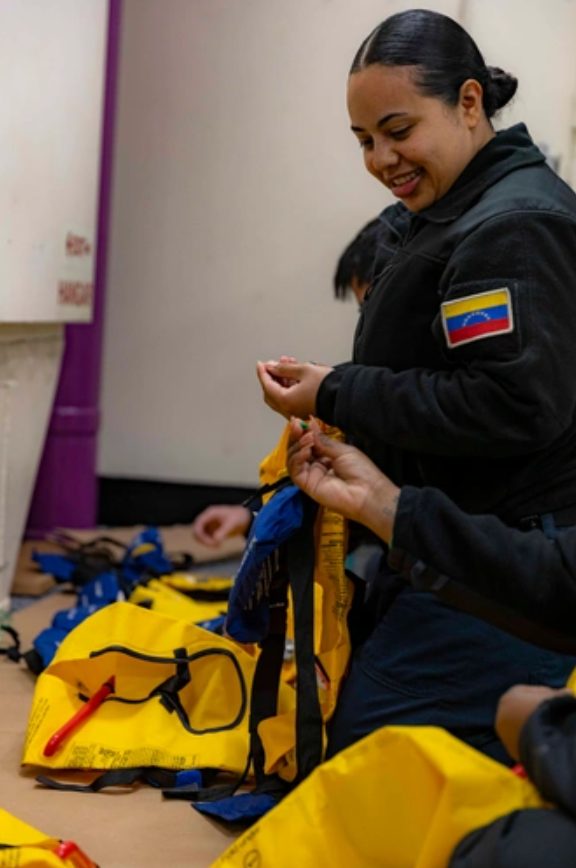 La suboficial de aviación (manejo de aeronaves) de primera clase Alix Marcano, asignada al Departamento de Seguridad a bordo del portaaviones más grande del mundo, el USS Gerald R. Ford (CVN 78), clasifica y guarda chalecos salvavidas, el 24 de agosto de 2025. (Foto de la Armada de los EE. UU. por la marinera especialista en comunicación de masas Brianna Barnett)