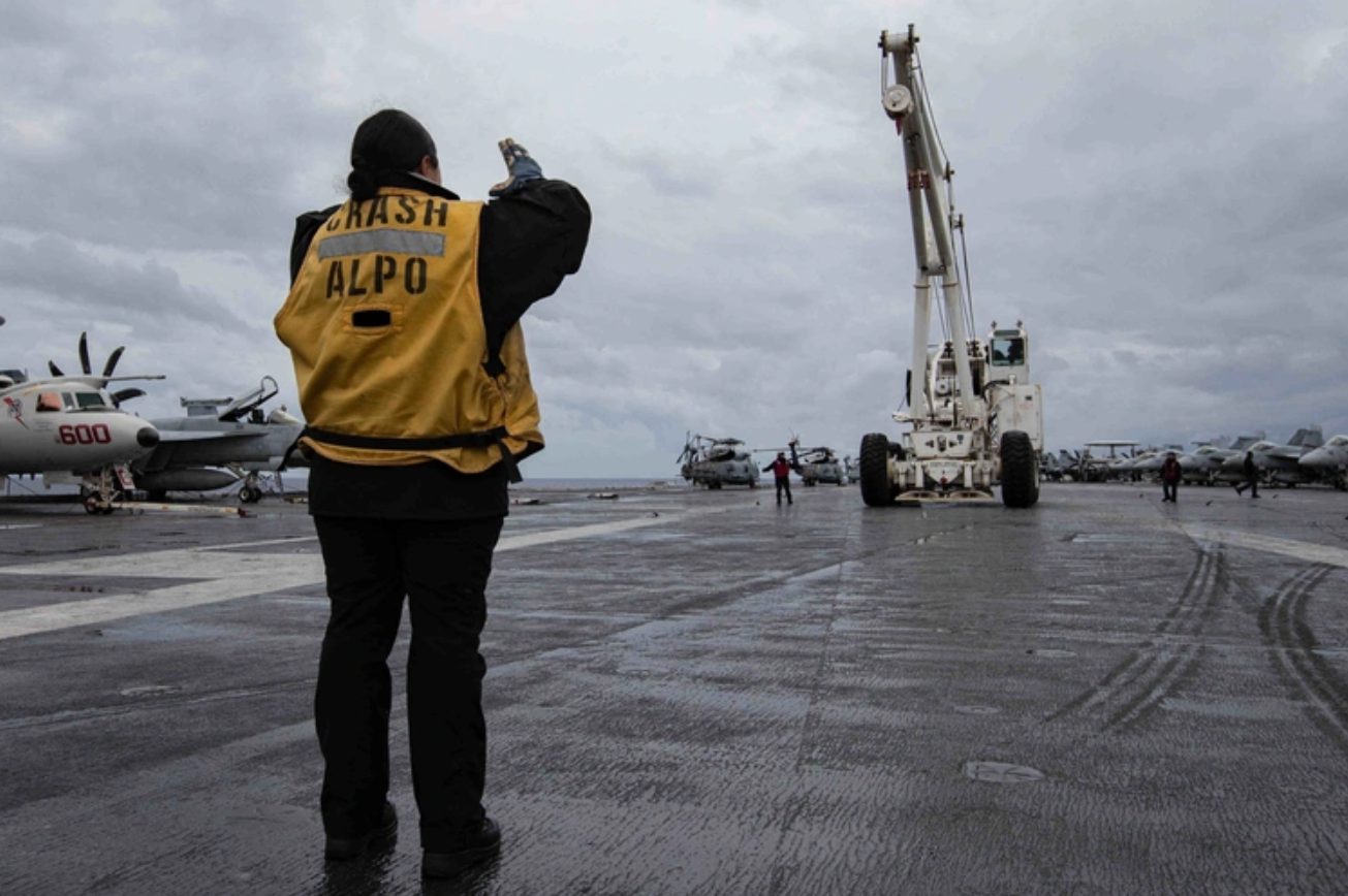 La suboficial de aviación de primera clase Alix Marcano, asignada al departamento aéreo del portaaviones más grande del mundo, el USS Gerald R. Ford (CVN 78), dirige la grúa de rescate de portaaviones (CVCC) “Tilly” durante una prueba de carga operativa en la cubierta de vuelo, el 10 de diciembre de 2023. (Foto de la Armada de los EE. UU. por el especialista en comunicación de masas de tercera clase Maxwell Orlosky)