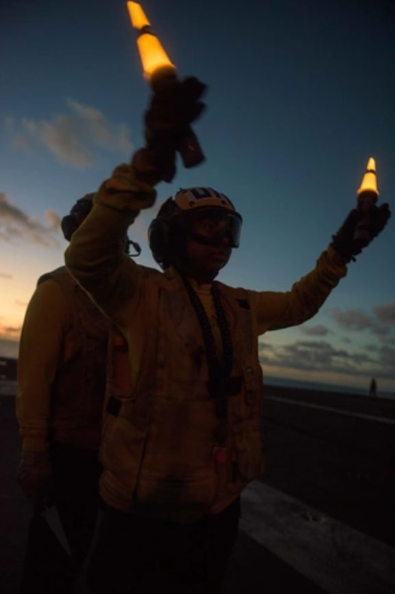 El chaleco amarillo es característico en los directores de operaciones, lo que los diferencia entre otros marineros sobre la cubierta de vuelo.