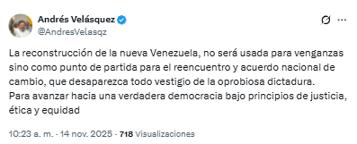 Velásquez dijo que la reconstrucción de la nueva Venezuela, no será usada para venganzas sino como punto de partida para el reencuentro y acuerdo nacional de cambio, «que desaparezca todo vestigio de la oprobiosa dictadura».