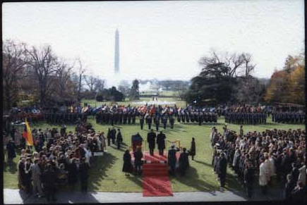 El 4 de diciembre de 1984, aquel jardín sur comenzó a transformarse en un escenario impecablemente coreografiado. La alfombra roja, extendida frente al South Portico, marcaba el camino de la comitiva venezolana mientras, al fondo, el Monumento a Washington se recortaba contra el cielo como una estampa clásica del poder estadounidense. Las unidades de honor formadas en abanico, los uniformes pulcros y el desfile del Cuerpo de Tambores y Fusileros daban a la ceremonia un aire casi fundacional.