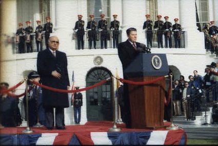 Como saludo oficial al visitante, el U.S. Army detonó las 12 salvas de rigor, un estruendo solemne que reverberó sobre el jardín y elevó aún más la majestad del acto. Desde la plataforma principal, Ronald Reagan esperaba con gesto firme; a su lado, Nancy Reagan, elegante y serena, aportaba un equilibrio perfecto a la escena.