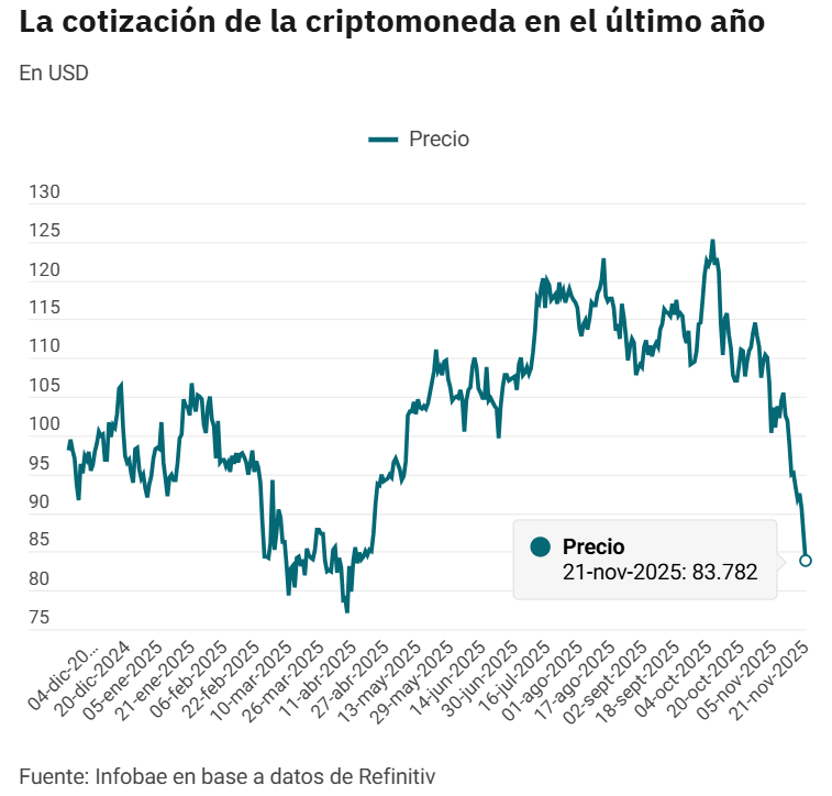 El precio de Bitcoin atraviesa una de las caídas más pronunciadas desde 2022, al perforar el nivel de USD 81.000 durante la jornada de este viernes, en un contexto marcado por una fuerte recomposición de expectativas globales y presiones de venta originadas en billeteras dormidas. De acuerdo con datos de mercado, el criptoactivo llegó a operarse a USD 80.659,81 en su valor más bajo del día, lo que representa una pérdida superior al 36% respecto de su máximo histórico de USD 126.080 anotado el pasado 6 de octubre de 2025. En tan solo 24 horas, la moneda digital retrocedió más del 7% y acumuló en el último mes una caída superior al 20 por ciento.