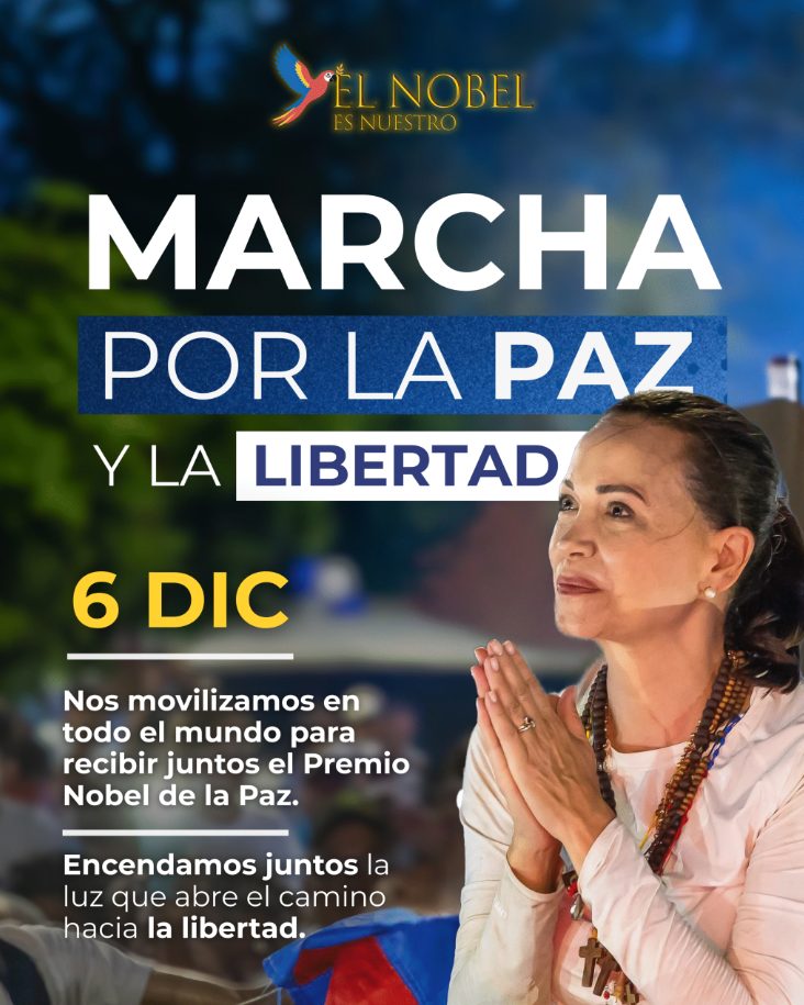El partido indicó que la convocada marcha «en todo el mundo» forma parte de un movimiento denominado ‘El Nobel es nuestro’, que, explicó, nace con el fin de simbolizar que «el reconocimiento no pertenece a una persona, sino a un país entero» y busca transformar el premio «en un megáfono global que proyecte la causa venezolana».