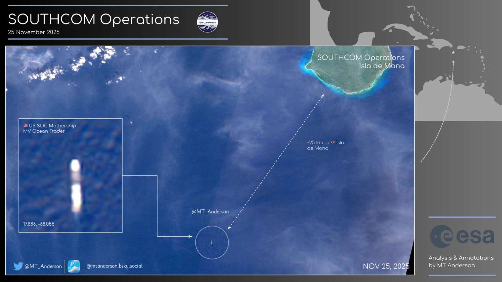 En un contexto de creciente tensión geopolítica en el Mar Caribe, nuevas imágenes del satélite europeo Sentinel-2 revelan la última posición conocida del MV Ocean Trader, el buque de apoyo a operaciones especiales de las Fuerzas Armadas de Estados Unidos.