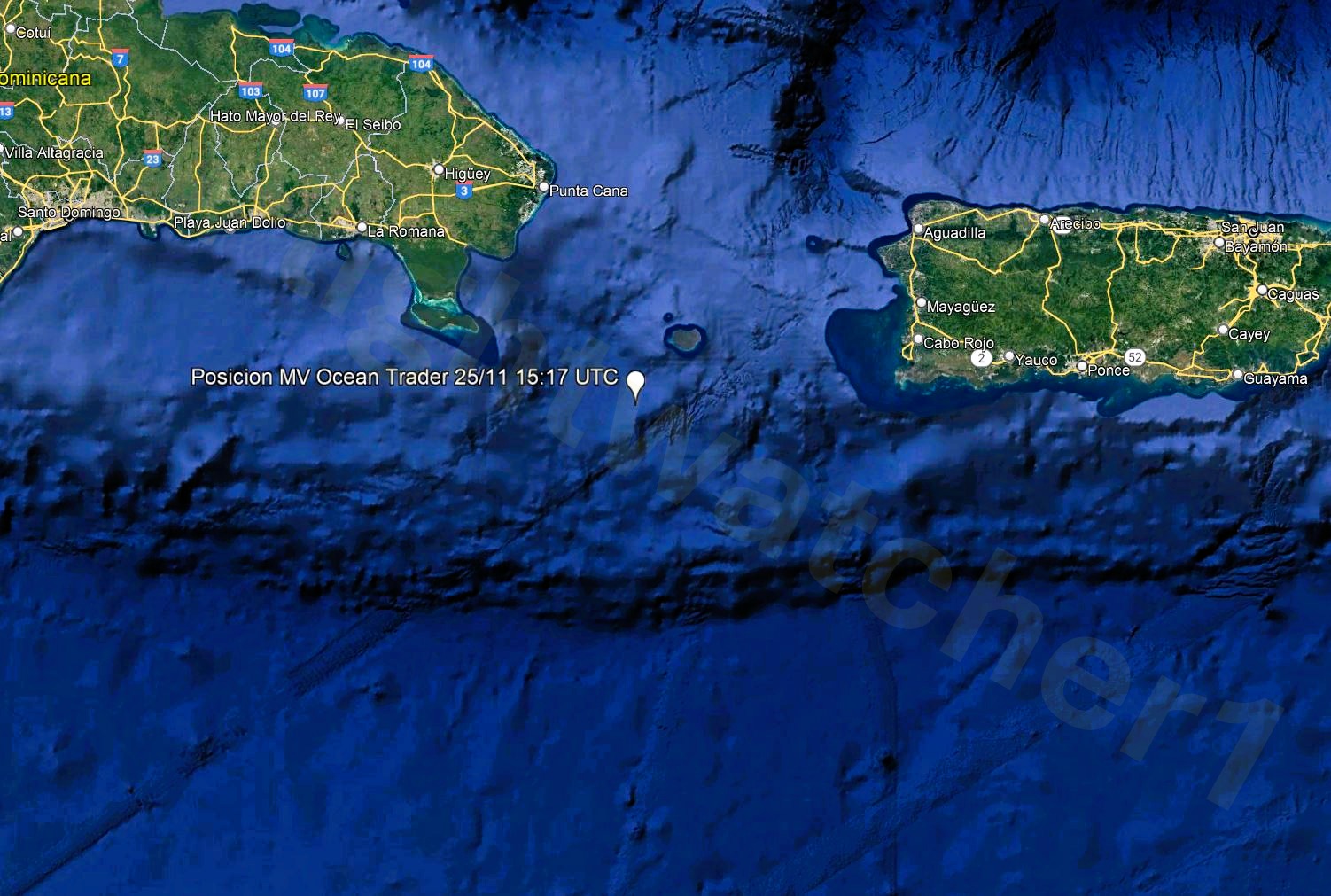 Las imágenes satelitales captadas el martes 25 de noviembre a las 3:17 pm muestran al MV Ocean Trader navegando en aguas abiertas del Atlántico Norte, unos 24,73 km (13,35 millas náuticas) al suroeste de la Isla de Mona, entre Puerto Rico y República Dominicana.