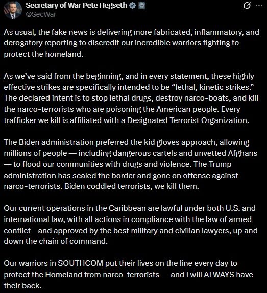 «Como hemos dicho desde el principio (…) estos ataques altamente efectivos están específicamente destinados a ser ‘ataques cinéticos letales’. La intención declarada es detener las drogas letales, destruir los narco-botes y matar a los narcoterroristas que están envenenando al pueblo estadounidense», afirmó el jefe del Pentágono.