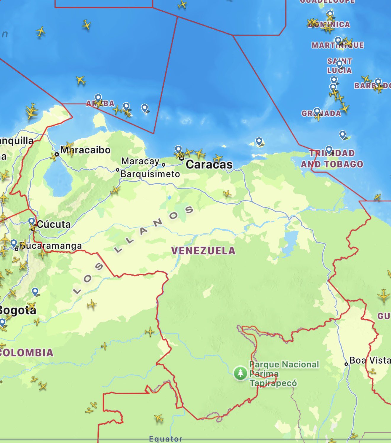 Las imágenes muestran un contraste evidente con el tráfico habitual en la región, en especial sobre Colombia, Panamá y las islas del Caribe, donde la actividad aérea se mantiene fluida mientras Venezuela aparece con un flujo mínimo de aeronaves.
