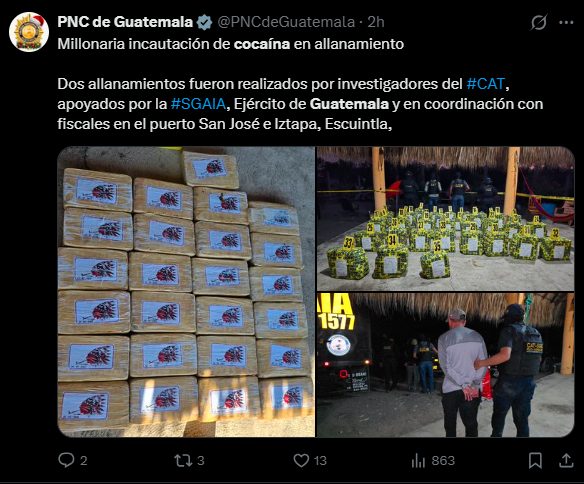 Los operativos, en seguimiento a investigaciones que se efectuaban sobre una embarcación que llegó a la costa del Pacífico de Guatemala procedente de Colombia, fueron ejecutados por la PNC, fiscales del Ministerio Público y el Ejército, detalló Monroy.
