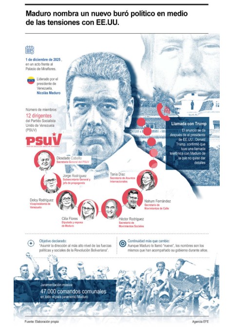 Nicolás Maduro, designó a doce dirigentes del chavismo para conformar un nuevo buró político del gobernante Partido Socialista Unido de Venezuela (PSUV), quienes, indicó, asumirán «la dirección al más alto nivel de las fuerzas políticas, sociales y de la revolución bolivariana», en medio de las tensiones por el despliegue militar de Estados Unidos en el Caribe.