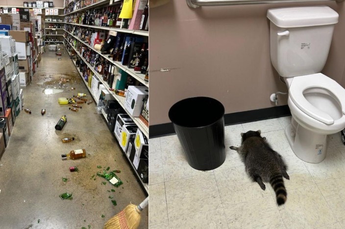 Fotografías distribuidas por las autoridades muestran un pasillo del establecimiento con más de una decena de botellas de alcohol tiradas en el suelo, algunas rotas, y varios charcos. Otra imagen muestra al mapache durmiendo en el baño entre el inodoro y la papelera.