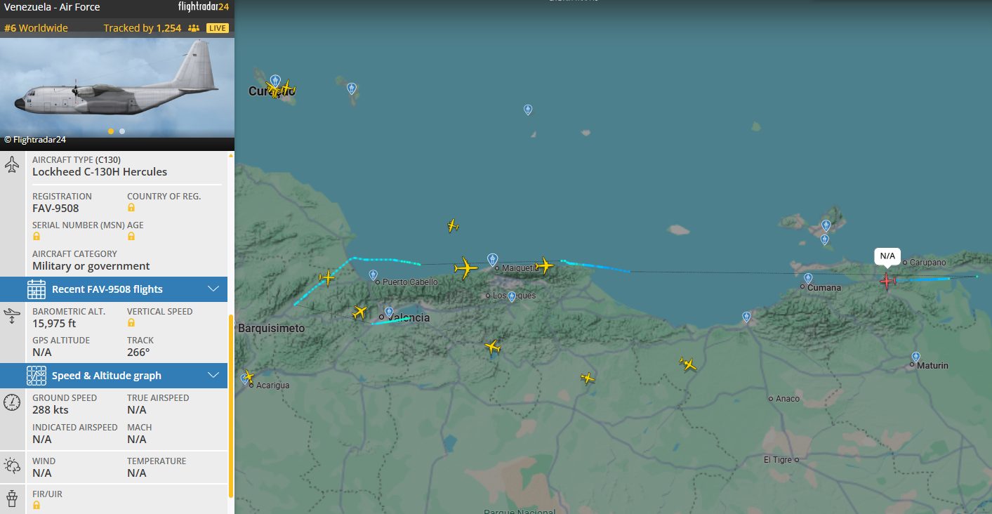 Según datos del monitor digital FlightRadar24, el C-130 partió desde el Aeropuerto Internacional Arturo Michelena de Valencia, estado Carabobo. A continuación, el avión recorrió Puerto Cabello y los estados La Guaira, Miranda y Sucre.