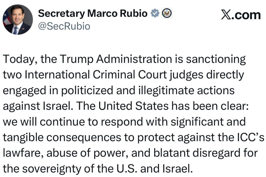 «La CPI ha persistido en acciones politizadas contra Israel, lo que sienta un precedente peligroso para todas las naciones. No toleraremos los abusos de poder de la CPI que violan la soberanía de Estados Unidos e Israel y someten indebidamente a ciudadanos estadounidenses e israelíes a su jurisdicción», anunció el secretario de Estado, Marco Rubio, en un comunicado.