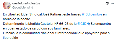 «Gracias a la comunidad nacional e internacional que apoyaron para su liberación», expresó la Coalición de Sindicatos en su cuenta en X.