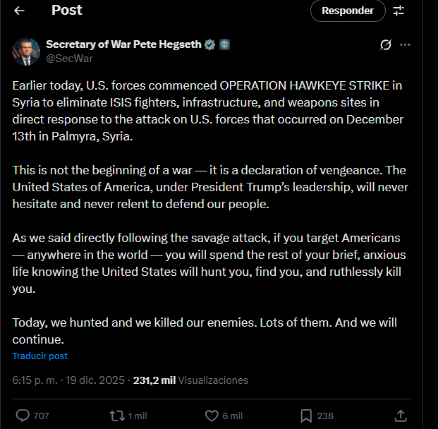El Secretario de Guerra de Estados Unidos, Pete Hegseth, anunció este viernes 19 de diciembre el inicio de la «Operación Ojo de Halcón» en territorio sirio, una ofensiva militar dirigida contra combatientes, infraestructura y sitios de almacenamiento de armas pertenecientes al grupo terrorista Isis.